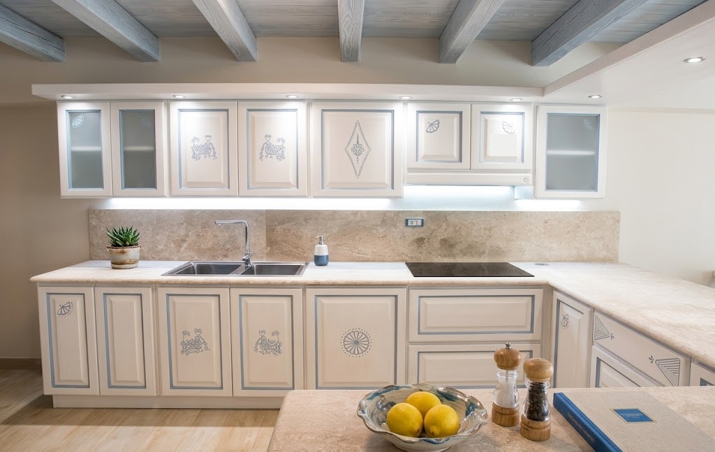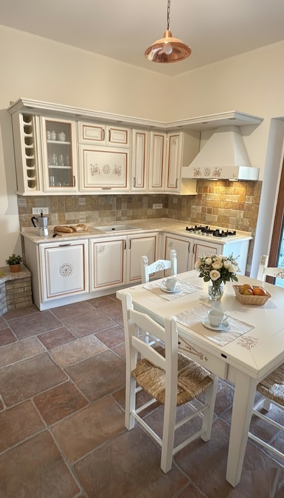 Ispirato al Shabby Chic, nei colori prevalentemente chiari e neutri, con l'esaltazione della venatura che varia dalle tonalità nocciola, al grigio, al rosa Antico. Dettagli unici. Materiali di altissimo livello e naturali. Top e Lavello in biancone di orosei sono una vera schiccheria.