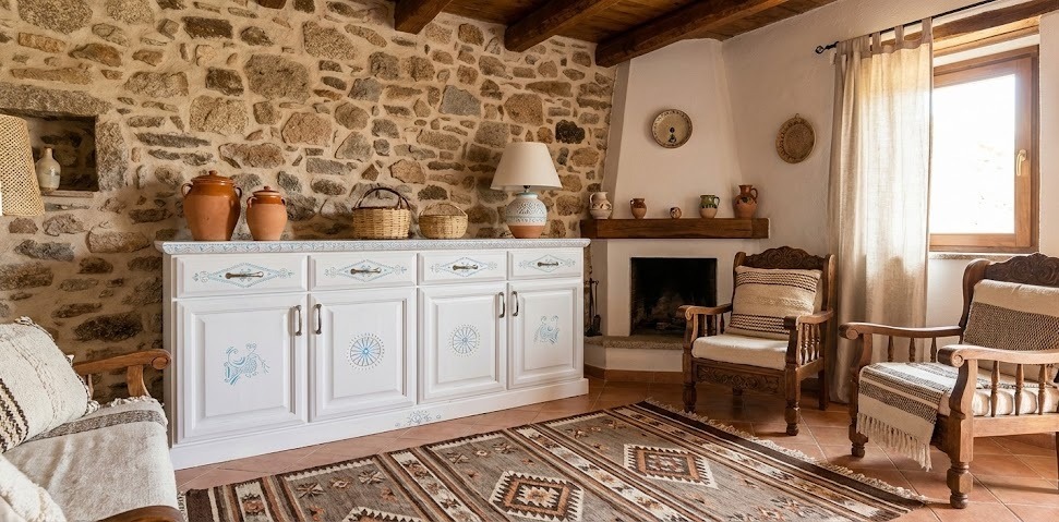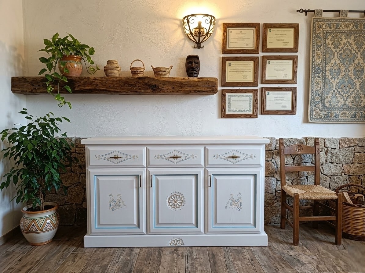 Madia artistica in massello frassino, intagliata e dipinta a mano
