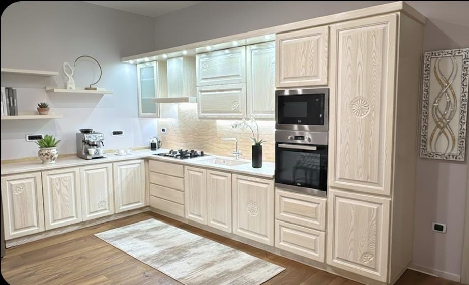 Colori Neutri con bellissime venature , dal nocciola al blu polvere. Gli intagli realizzati a mano. I vetri artistici e ogni dettaglio parla e profuma di Sardegna